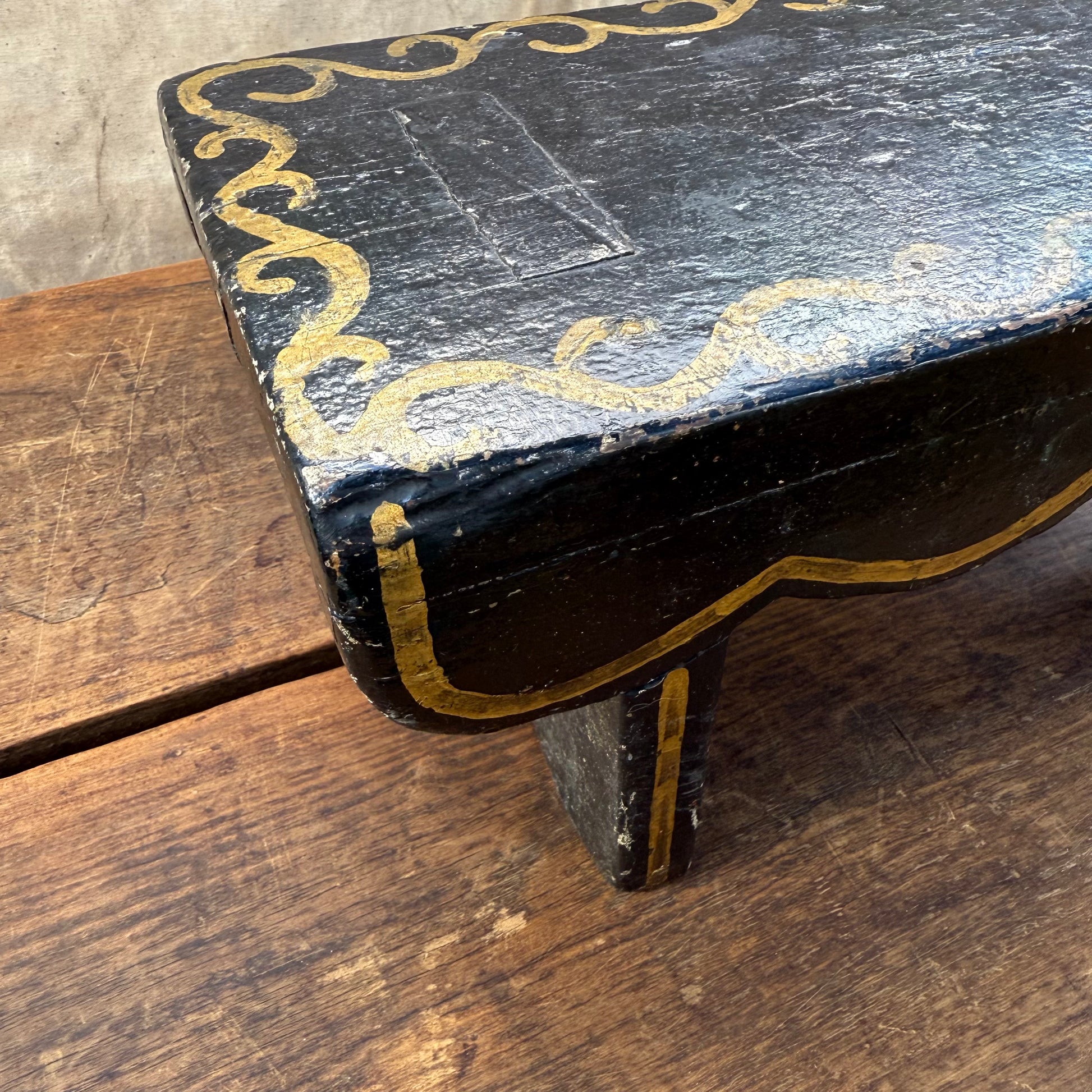 19th century painted scallop edge footstool with mortise and tenon joinery. Gold decoration over gloss black ground.