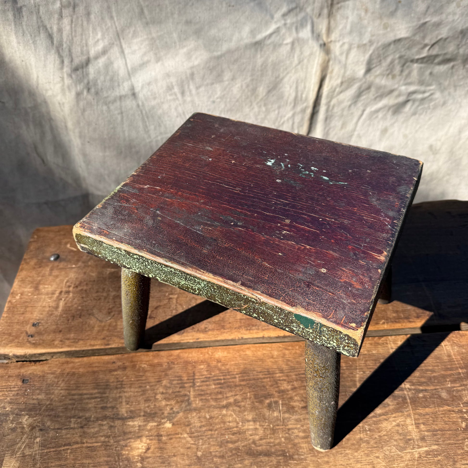 Crackled and alligatored green paint over a chocolate brown ground. Top is chocolate. Pegged legs.