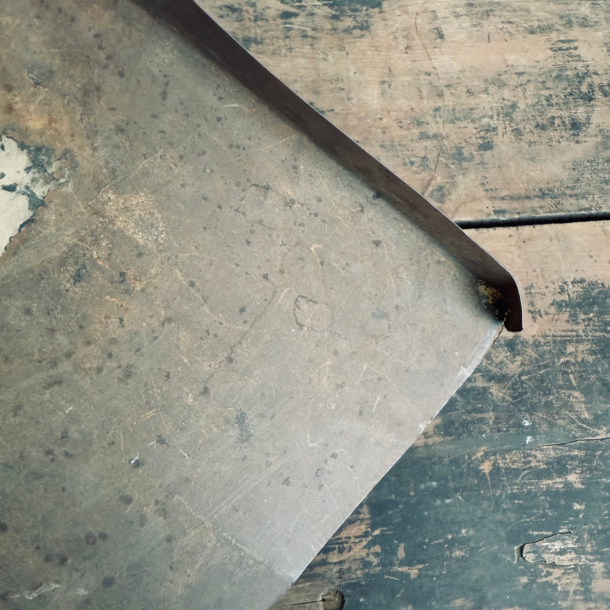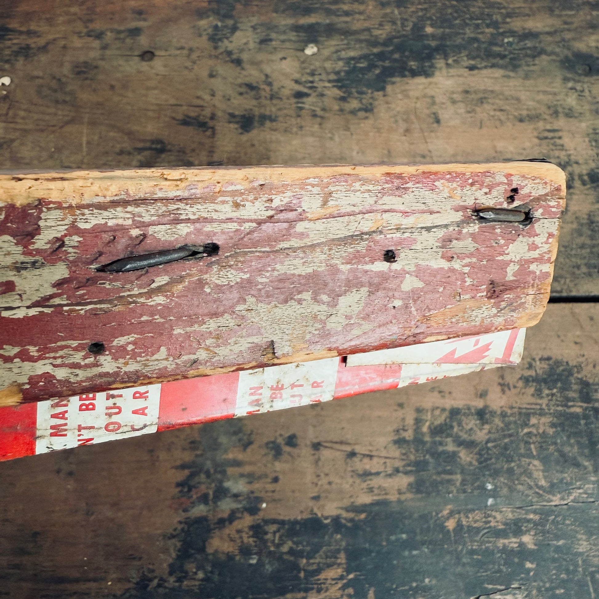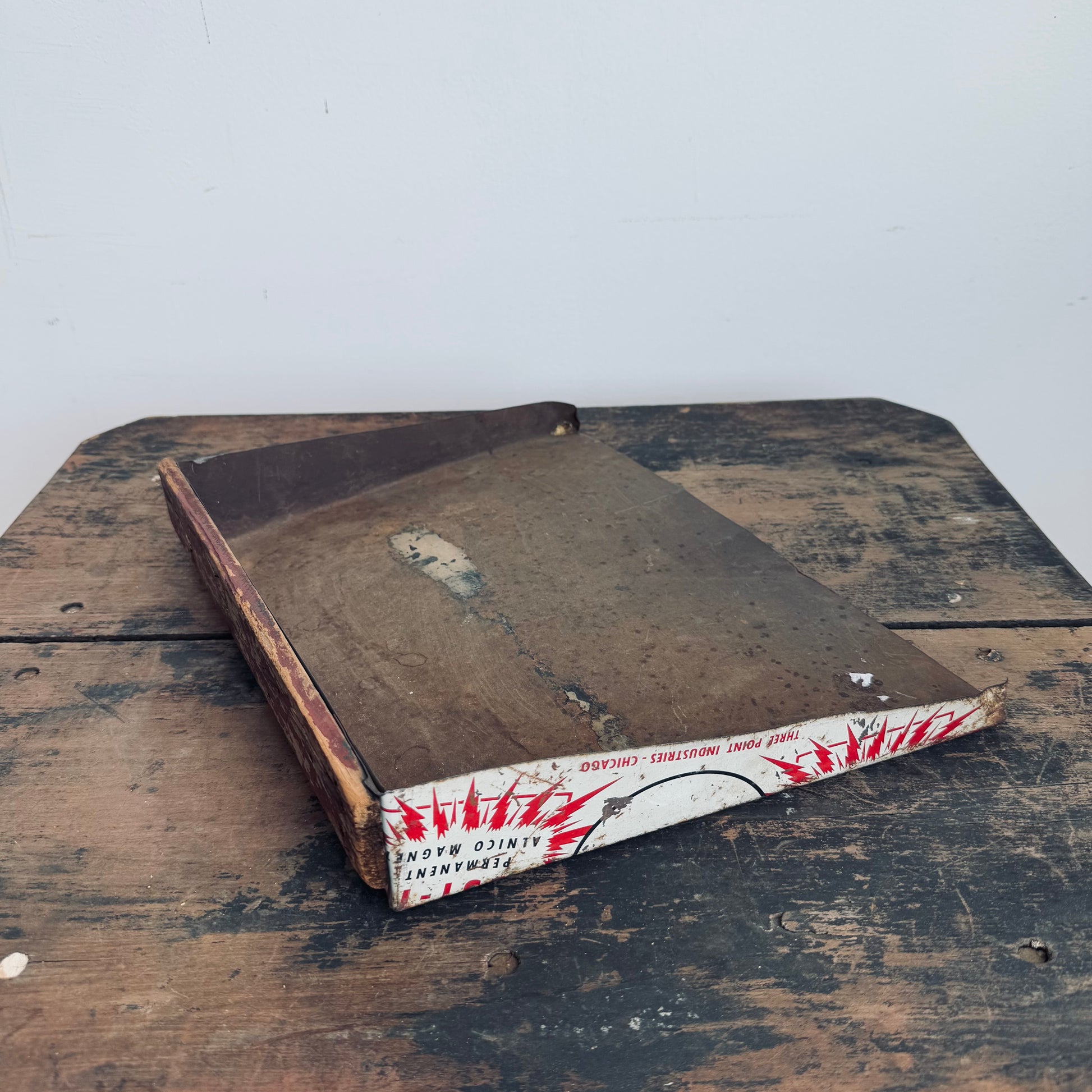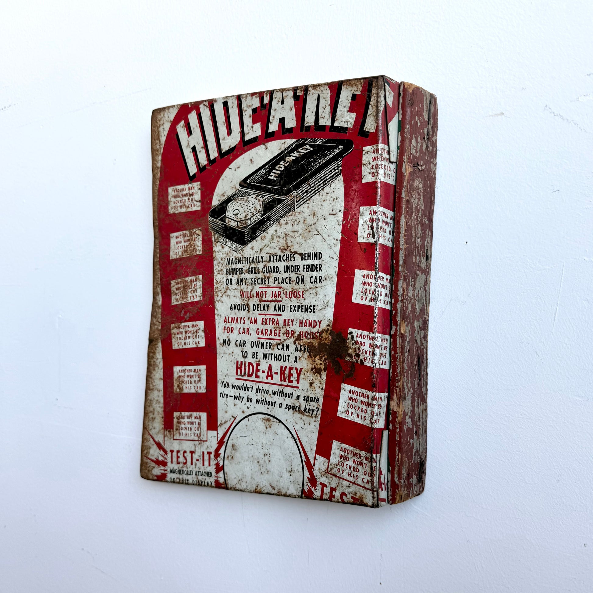 Circa 1950s dustpan made from a Hide-A-Key metal advertising sign with an added wood handle. This is a utilitarian object that has withstood time and use and can still function as a dustpan.