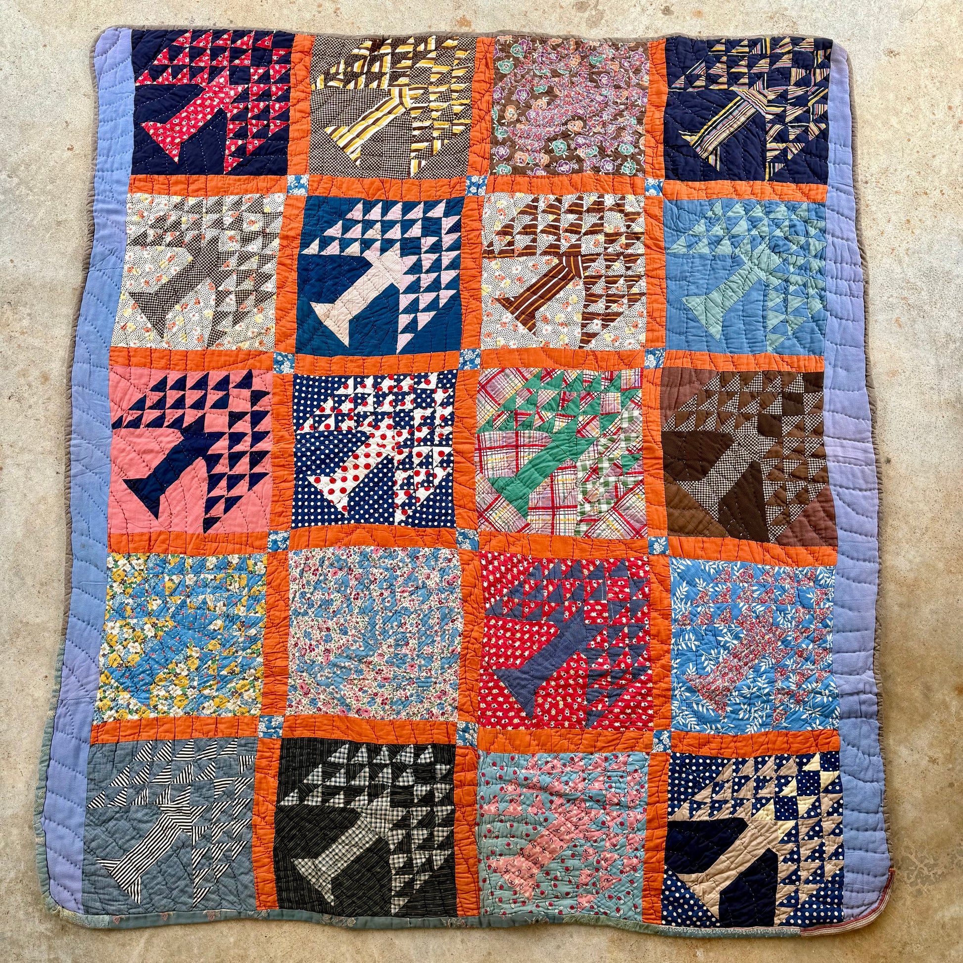 Made in West End, North Carolina, circa 1940s this Tree of Life quilt features an vibrant palette of color and pattern. The back is home dyed indigo cotton muslin or feedsack. The corners are rounded. This quilt is soft and meant to be used, and it's spectacular enough to hang on a wall.